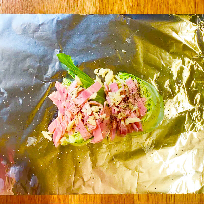 - アルミホイルを広げてキャベツをおき、ベーコンとニンニクをのせる。