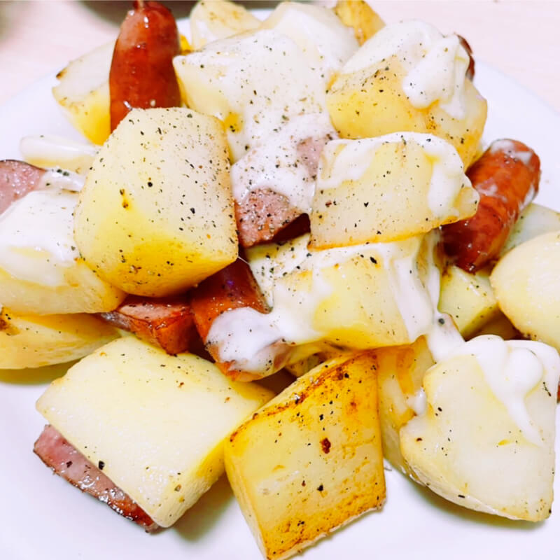 - ウインナーとベーコンに火が通ったら、ジャガイモを加えてさらに炒め、塩・こしょうで味をととのえる。